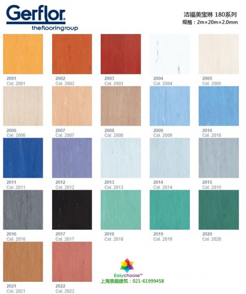 美寶琳180是一種彈性均質透心材料,可以制成卷裝,具有抗靜電性能。有方向性的花紋設計,顏色表里如一,花色齊全。其表面密實、耐磨、易于維護。